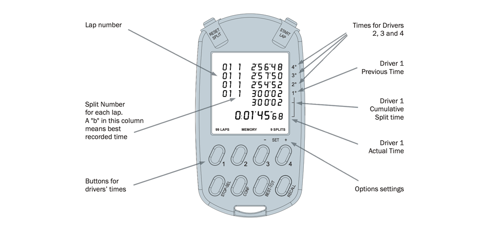 The MultiChron stopwatches' innovative programming allows you to get accurate times even when racers are close together at the lap marker: selecting 'Multi-Key', you can attribute times to each racer by pressing 1, 2, 3, or 4 buttons.