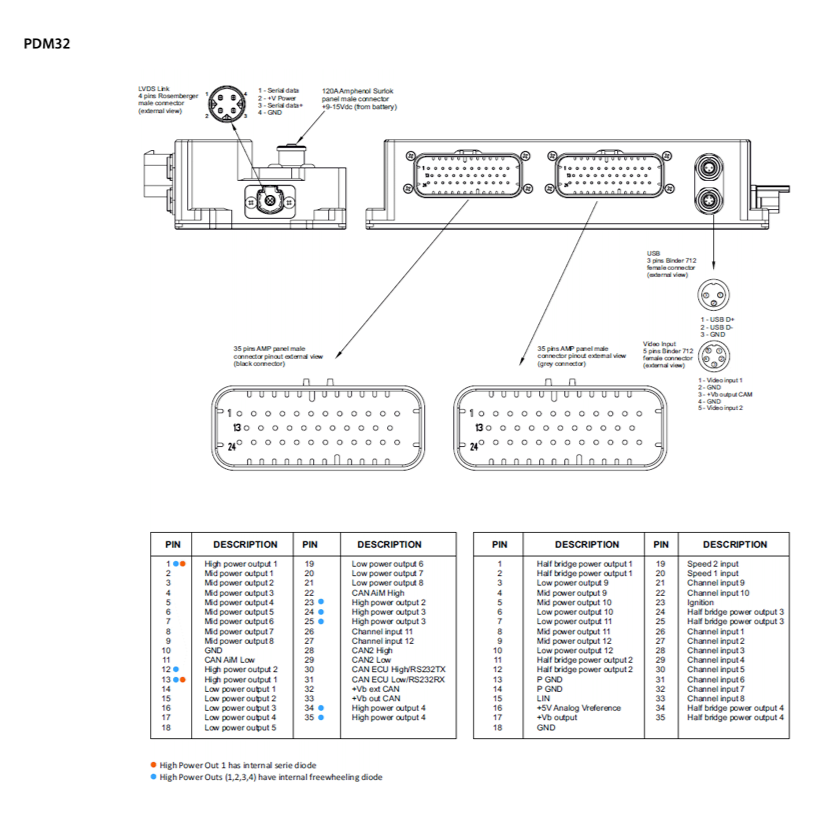 The Aim PDM32 is a 32-channel advanced power distribution module designed to power a multitude of vehicle circuits, removing the need for traditional fuse boxes and relays. It allows for a simplified wiring harness with increased reliability and control functions.