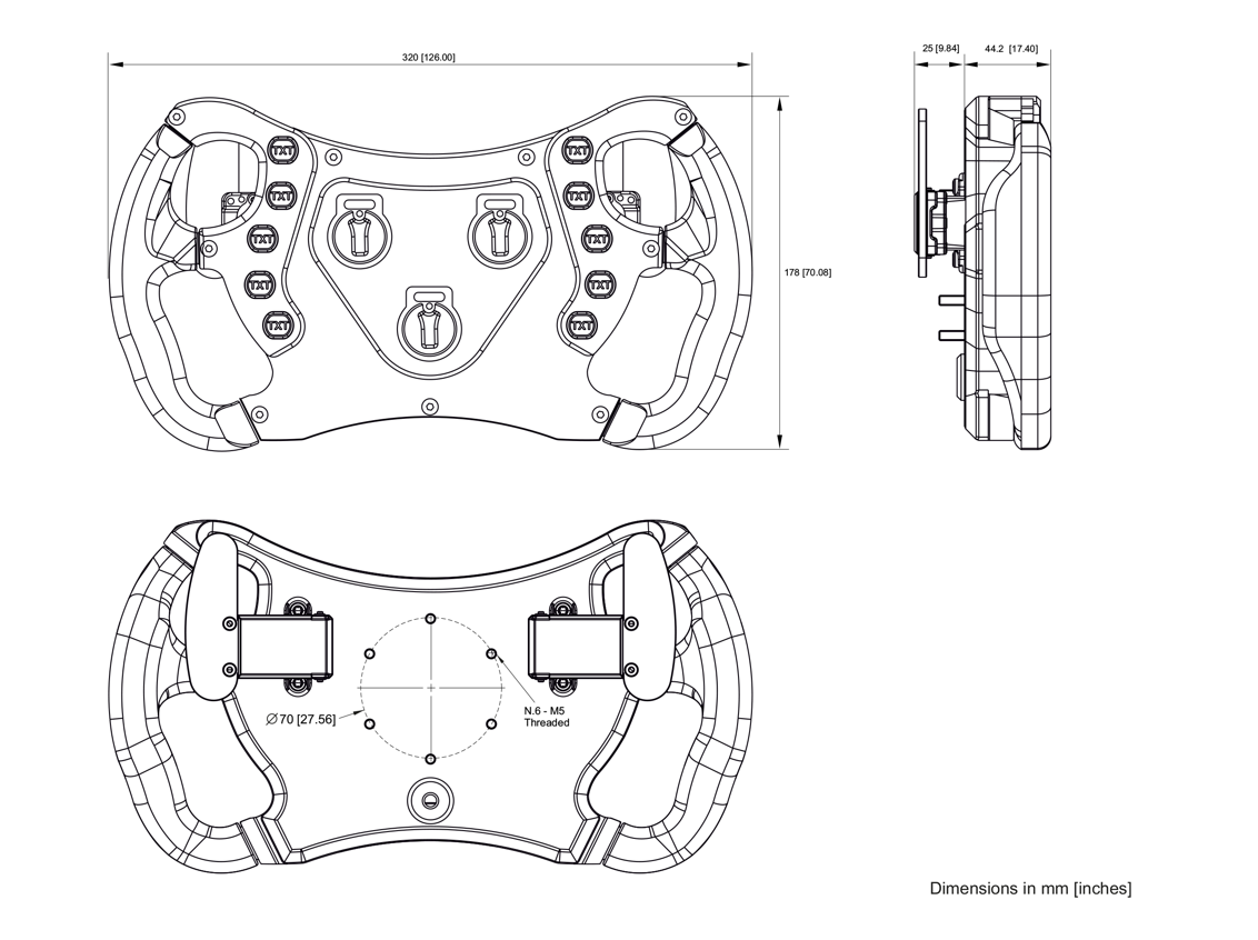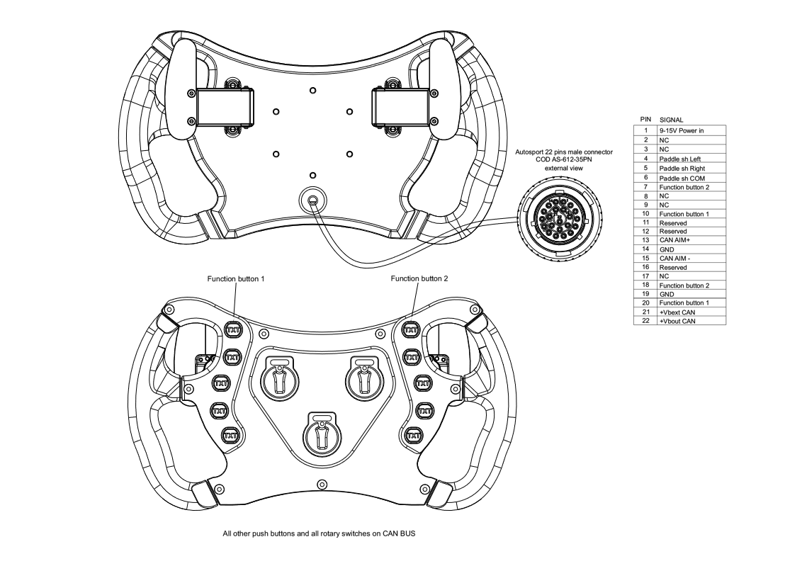 The GT32 Electronic Steering Wheel transmits the status of 8 push buttons and 3 rotary switches through a fully configurable CAN connection, plus 2 additional push buttons via free contact connections. It also supports 2 optional carbon fibre paddle shifters with a precise magnetic system for reliable, high-quality gear shifting.