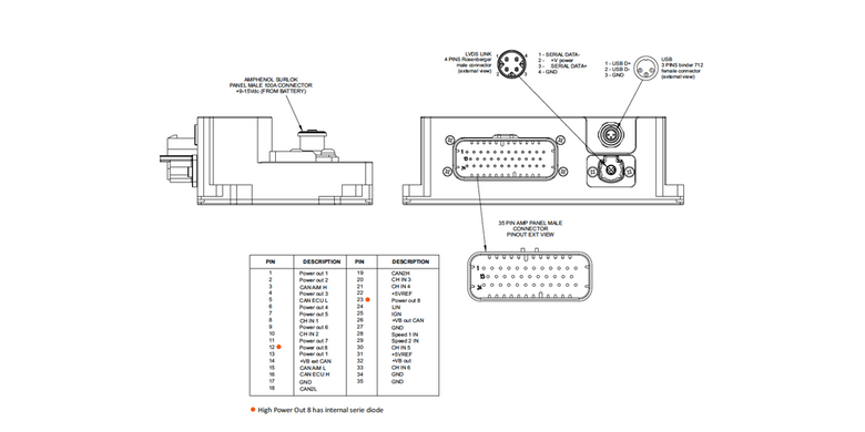 The PDM08 features 8 high-side outputs: 1x with series diode rated up to 20A, 1x rated up to 25A, and 6x rated up to 15A, with a total continuous max current of 100A. Each output provides feedback to the data logger to provide vital information such as open circuits, short circuits, high/low voltage, and the number of fault retires. The time between the retires is user-definable. All outputs can be configured as PWMs for a soft start/stop. All of the PDM circuits can be set up and monitored via the Race Studio 3 software.