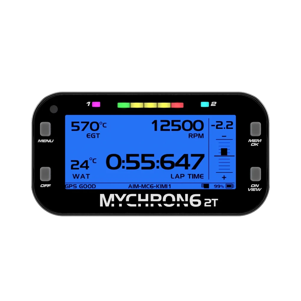 The Aim MyChron 6 2T is our best-selling GPS lap timer with two sensor connections, specifically crafted for karting. Combining 30 years of experience with advanced technology, the MyChron 6 2T offers precise lap timing and advanced data analysis for both amateur and professional racers.