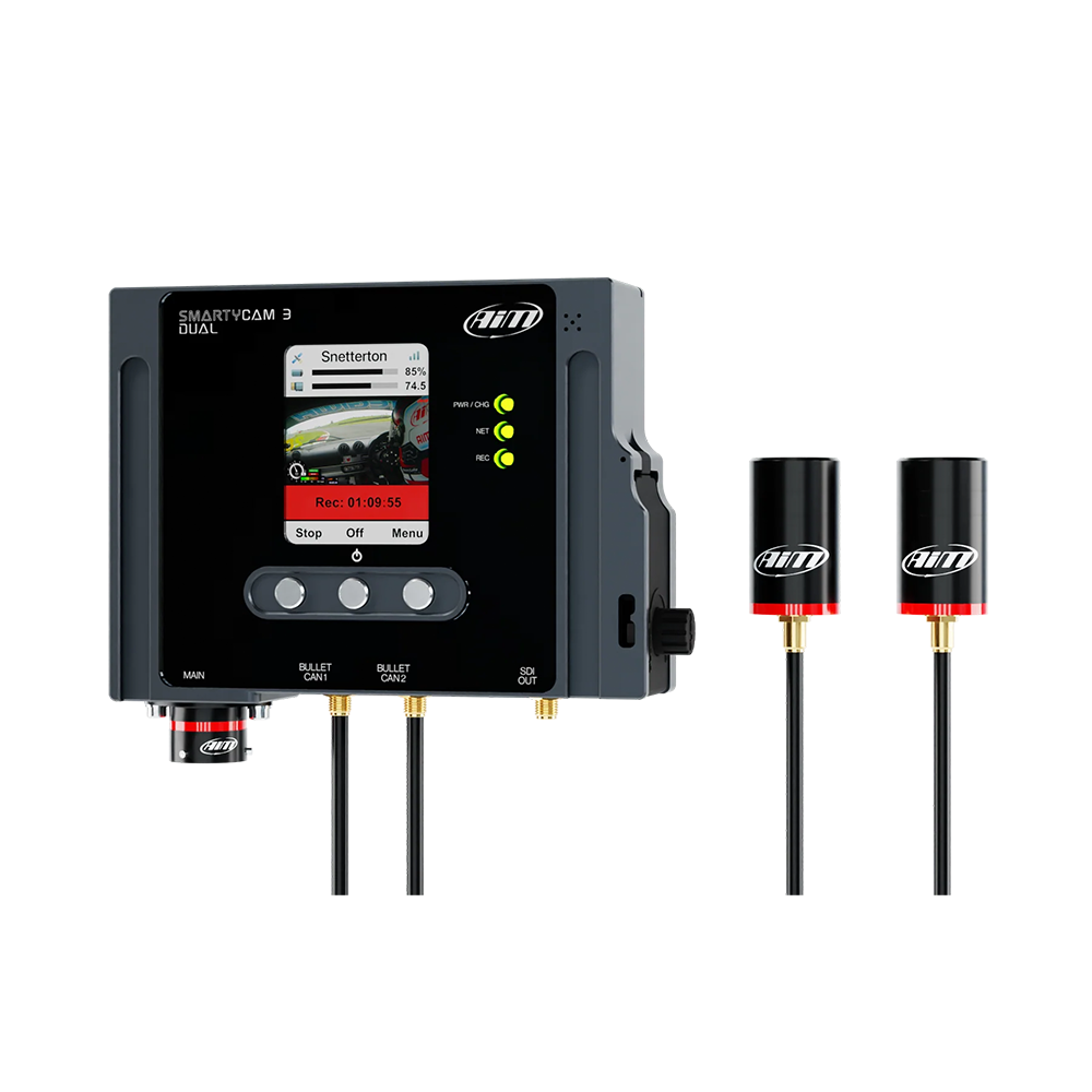The Aim SmartyCam 3 Dual is a professional onboard motorsport system with 2 bullet cameras. It automatically powers on and off in-sync with your engine and will auto start/stop recording based on parameters you set. It saves all your information to a supported SD card for up to 2TB of data, including speed, RPM, lap number, gear shifts and more.