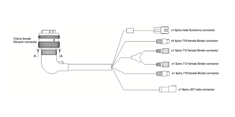 The Legends cars' specific 37-pin Deutsch connector harness allows connection to the vehicle battery and ECU directly, through the 8-pin, white JST connector labelled “ECU”, and to the onboard gear sensor, through the 6-pin, white Sumitomo connector labelled “CH. 1”.